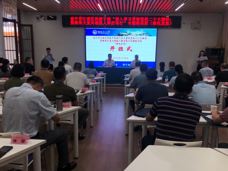 7月18日上午,南宁市江南区科级干部“深入学习贯彻党的二十大精神,紧跟伟大复兴领航人踔厉笃学”专题轮训班(绿色发展)在我校顺利开班。江南区人民政府副区长、党组成员蒋骎,学校tyc1286太阳成集团副院长张海林以及来自南宁市江南区的40余位学员参加了开班式。