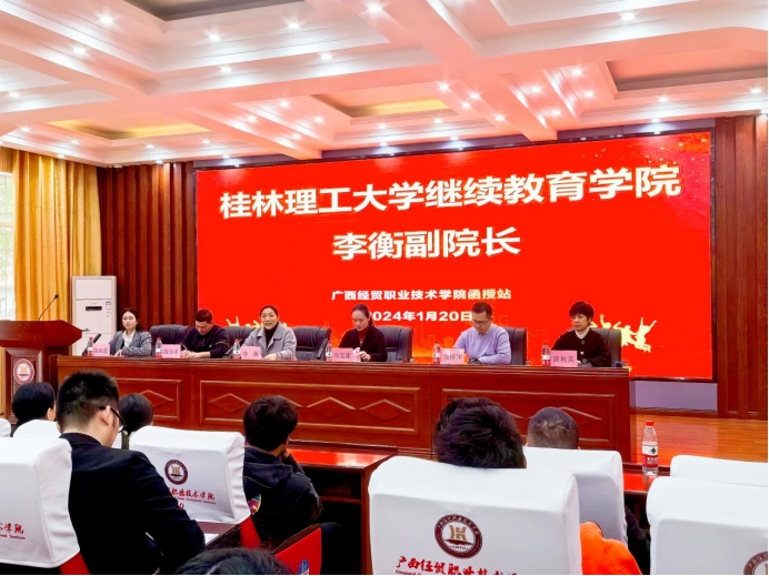 1月21日上午,我校校外教学点广西经贸职业技术学院举办的2024级成人高等教育新生开学典礼在该校6101学术报告厅隆重举行。太阳成官网副院长李衡,广西经贸职业技术学院tyc1286太阳成集团院长韦雯珊等出席活动。李衡副院长热烈欢迎2024级新生加入桂林理工大家庭,并对同学们提出了殷切希望。她表示,非常乐见同学们能在工作之余选择高等学历继续教育的学习形式来提升自己,希望同学们在工作生活中能将理论与实践相结合,将工作与学习相融合,尽快适应新的学习环境和学习方式,使学习的成果能够在工作中得以检验,为自己的终身发展积蓄力量。
